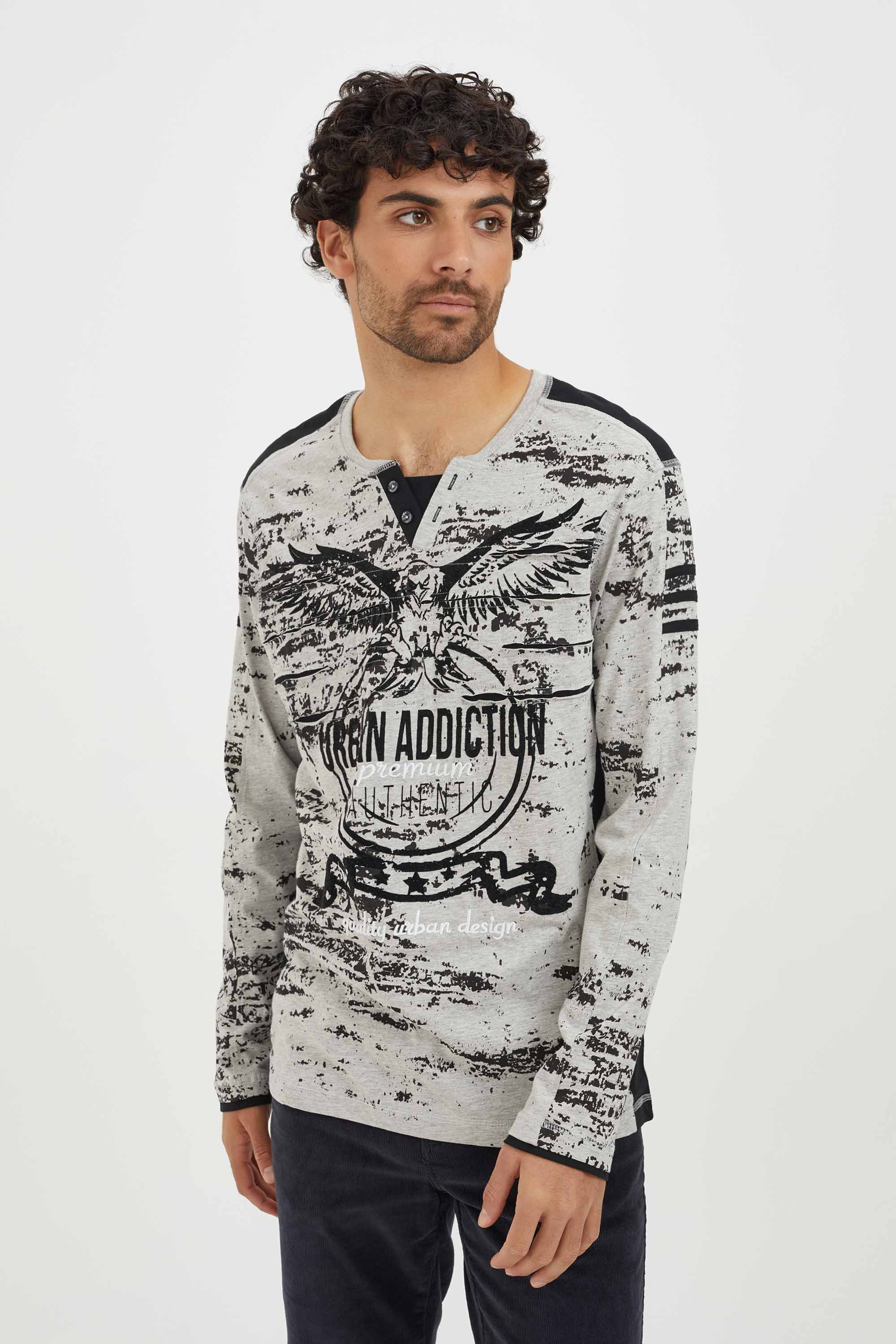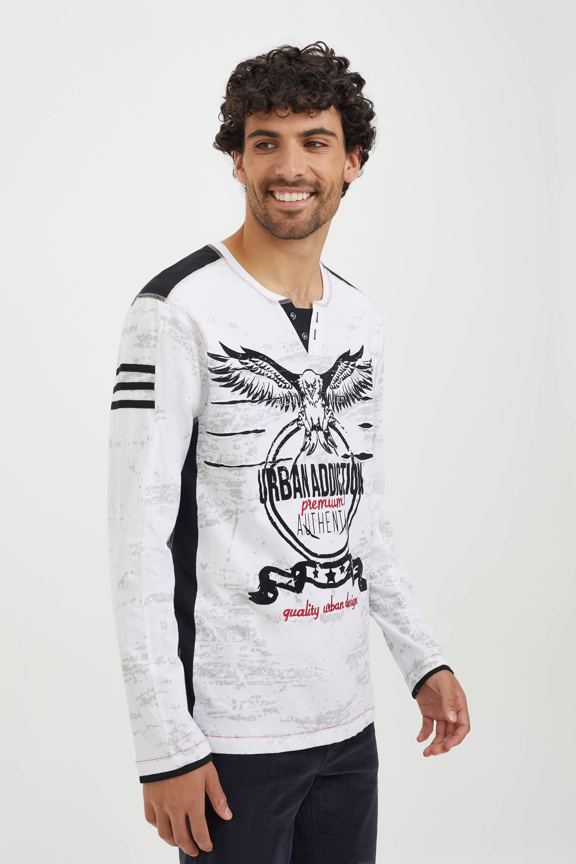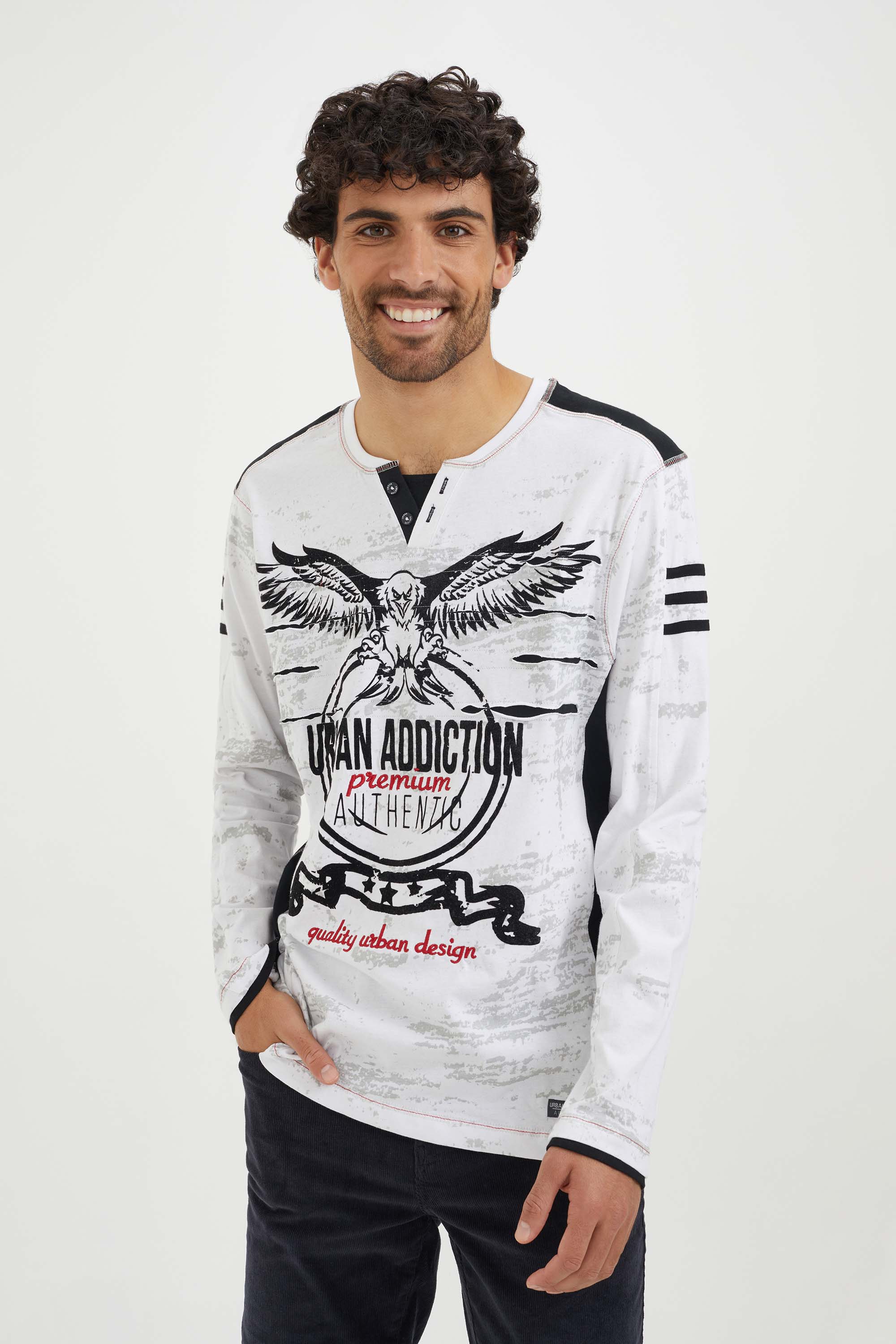 Ce haut présente des coutures contrastantes, des boutons au col et un imprimé Urban Addiction propre à la marque.