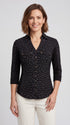 This utility-inspired, V-neck button-down blouse features adjustable 3/4 sleeves and buttoned flap pockets.