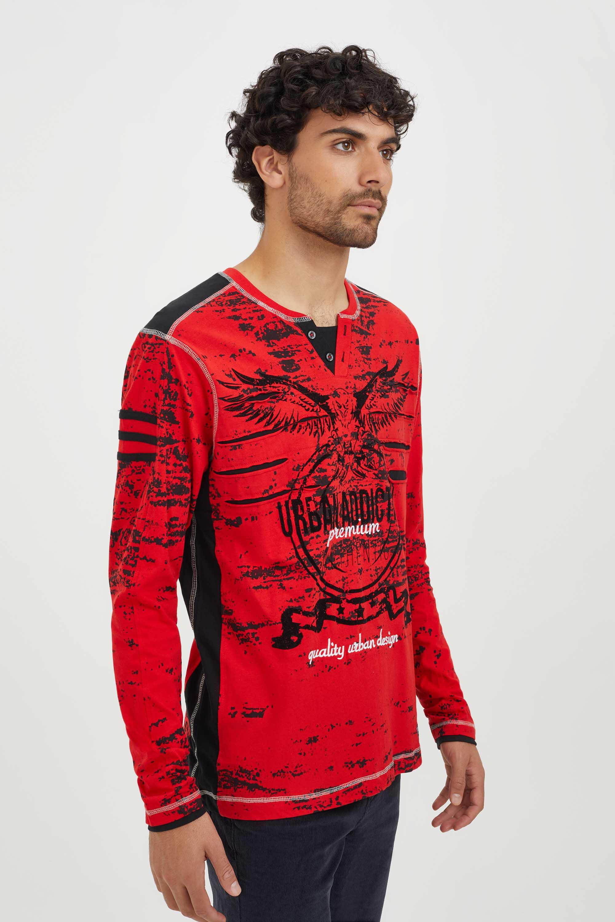 This top offers contrasting stitching, buttons at the collar and an Urban Addiction print specific to the brand.