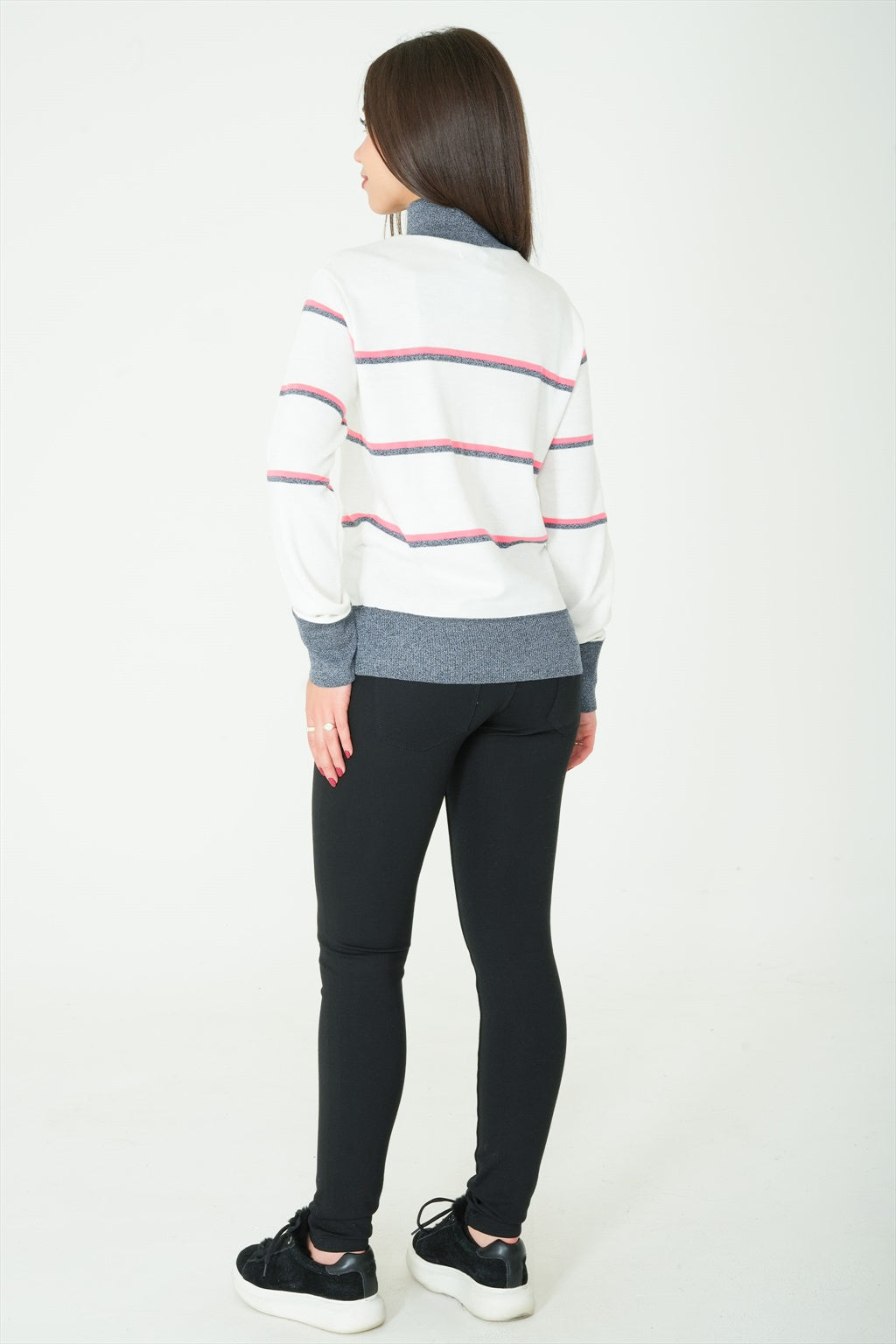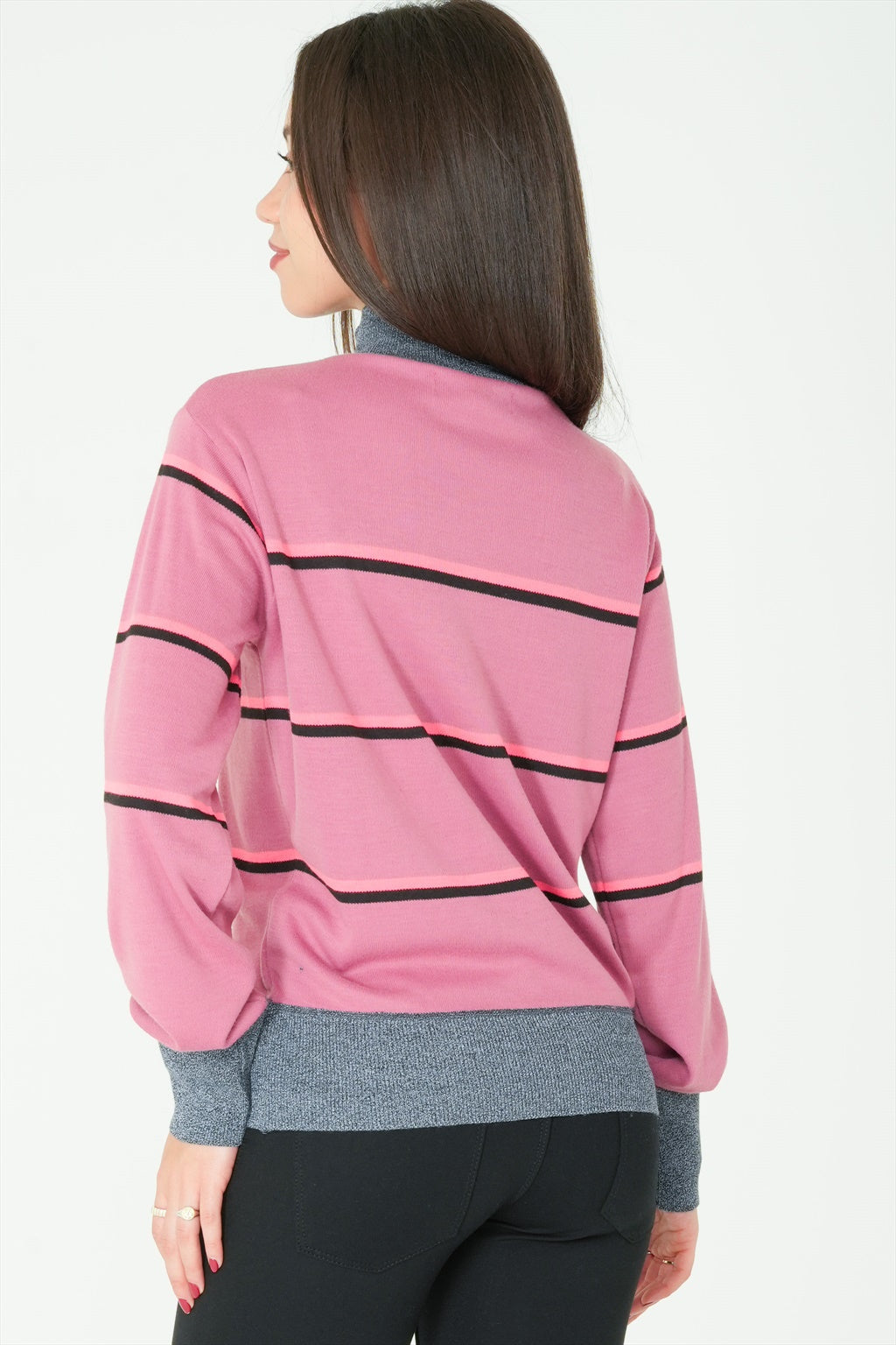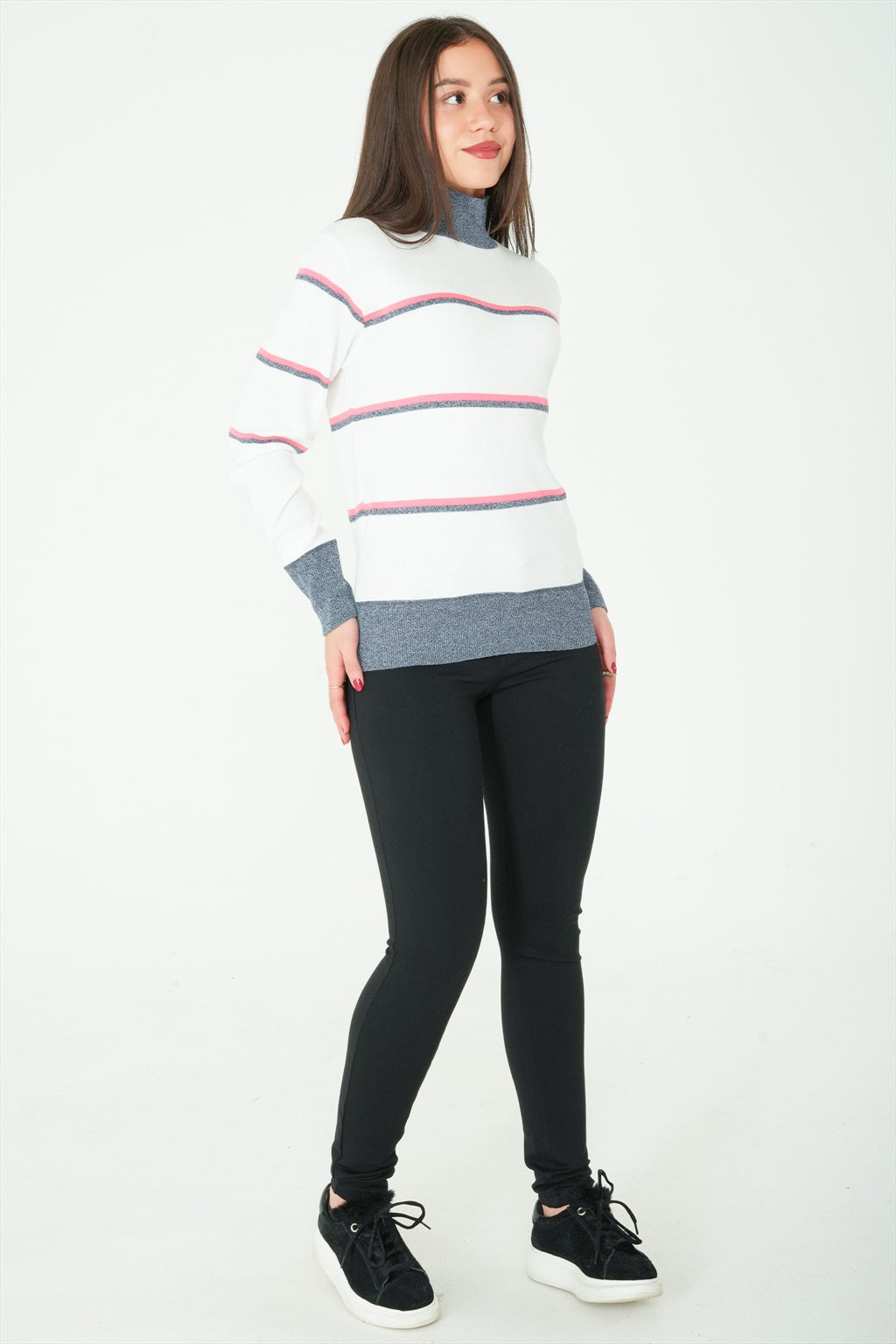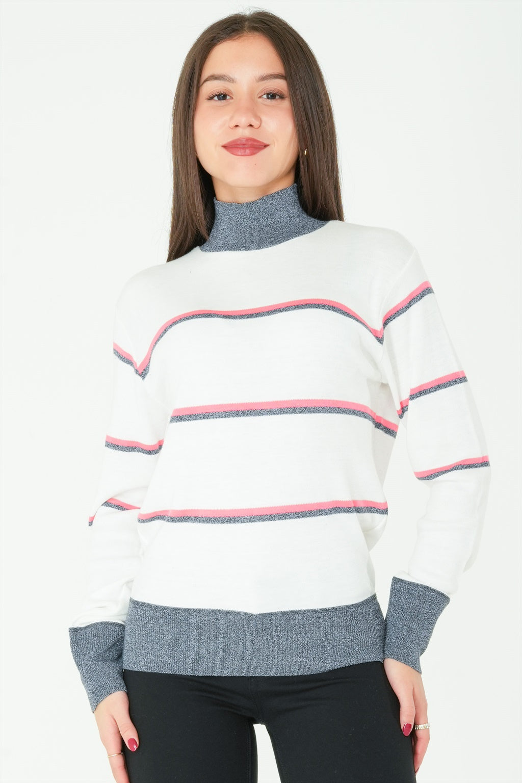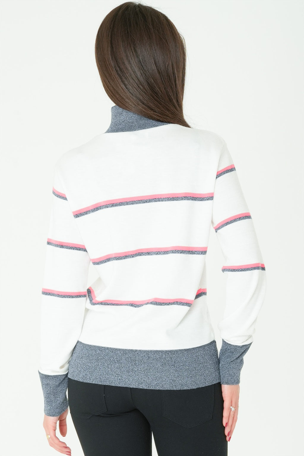 This long-sleeve high-neck sweater is the ideal top for when the weather starts to drop. Featuring stripes, it is sure to provide you with a great style.
